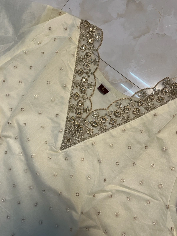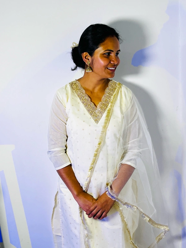 Beige Chanderi Silk Cotton Kurti With Dupatta And Pant